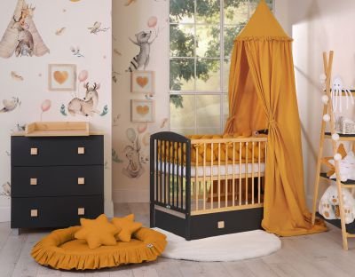 – Trīs matrača rāmja augstuma līmeņi – augšējais līmenis ērtai mazuļa kopšanai, vidējais līmenis mazuļiem vieglai kopšanai, bīdāms un drošs mazulis. Zemākais līmenis, kad bērns jau ir sāk staigāt. Noņemot noņemamos pakāpienus, jūsu bērns varēs izkļūt no gultiņas.