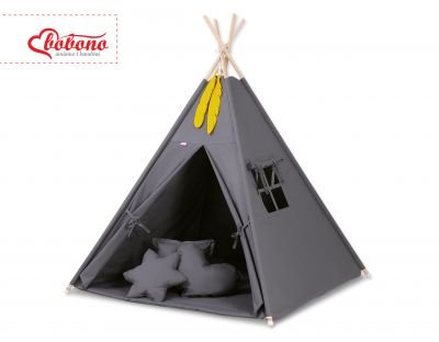 MINI komplekts: Teepees telts + rotaļu paklājiņš + dekoratīvas spalvas – antracīts